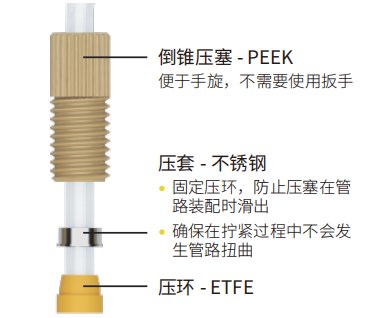3.手動旋擰倒錐壓塞使之緊壓壓套,壓套壓緊壓環(huán),從而使管路產(chǎn)生微變形達(dá)到密封效果。