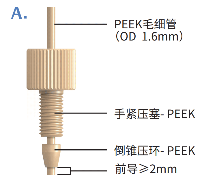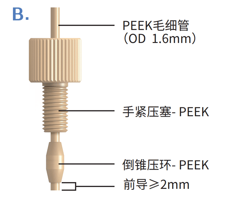 ●適配管路:適用1.6mm外徑PEEK/PTFE/ETFE/FEP和其他材質(zhì)半剛性管路