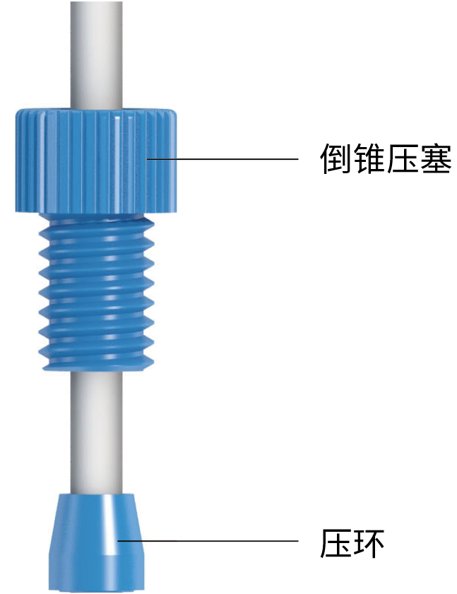 2. 依次套入倒錐壓塞、壓套、壓環(huán),手動(dòng)調(diào)整使壓環(huán)底部與硬管端面齊平,并使壓環(huán)的錐形端與倒錐壓塞螺紋端、壓套相吻合