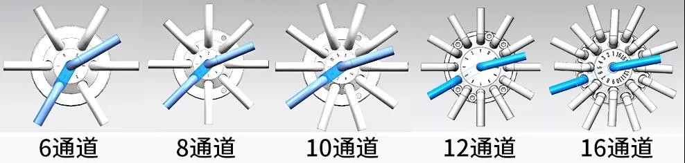切換閥根據(jù)通道的個(gè)數(shù)可分為6通道、8通道、10通道、12通道、16通道