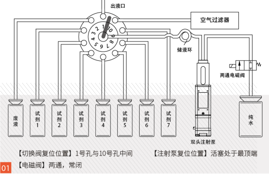 2、切換閥復位,電磁閥開啟,注射泵抽水(抽水量比儲液環(huán)的量大一點);